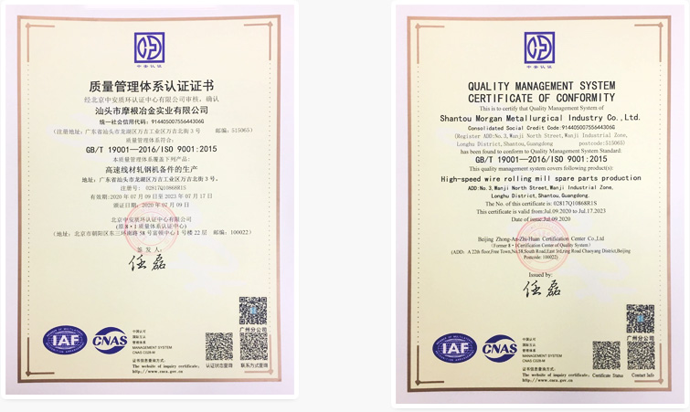 公司通過(guò)了ISO9001:2000質(zhì)量體系認(rèn)證,目前,公司產(chǎn)品已為全國(guó)多家大型鋼材生產(chǎn)廠家提供優(yōu)良高線軋機(jī)配套備件,目前在生產(chǎn)線上運(yùn)行良好,深受客戶信賴。